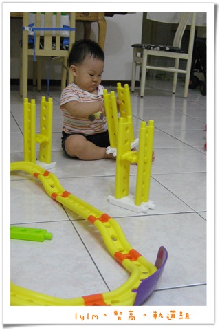 看他一屁股坐在老爸組好的軌道上就知道